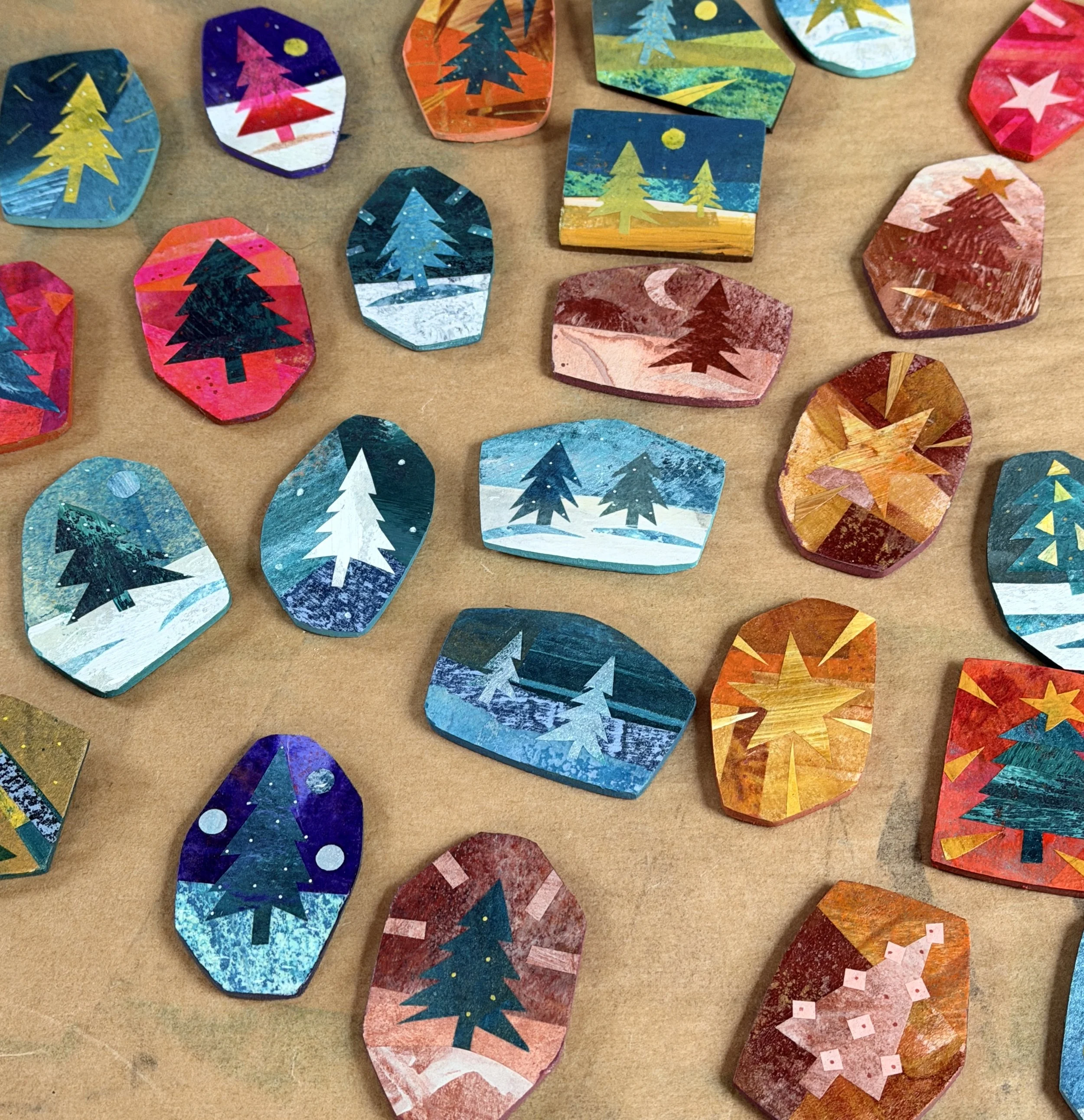 My lengthy search for a nice arty brooch resulted in me getting creative with wooden shapes, paint and collage scraps.