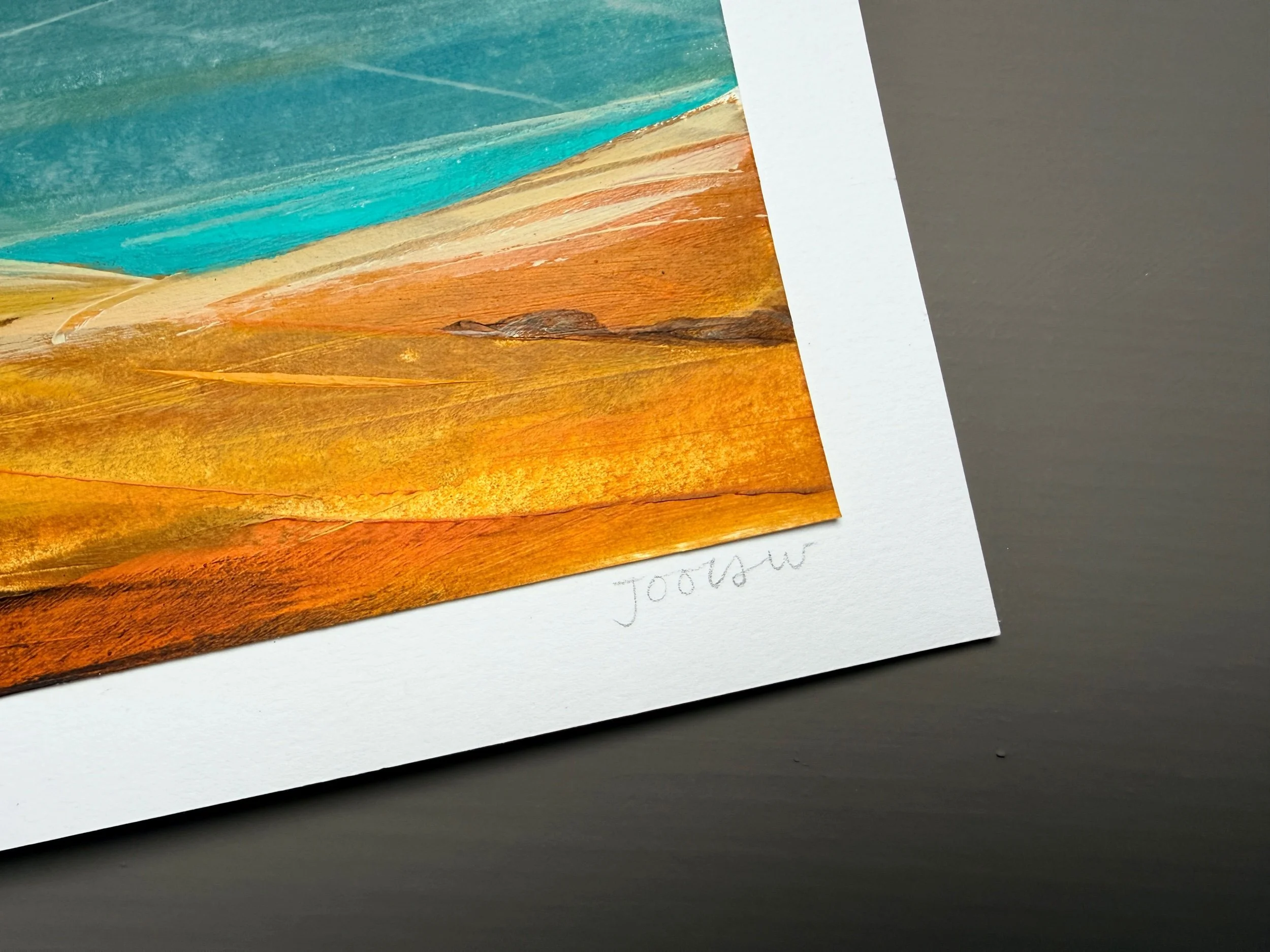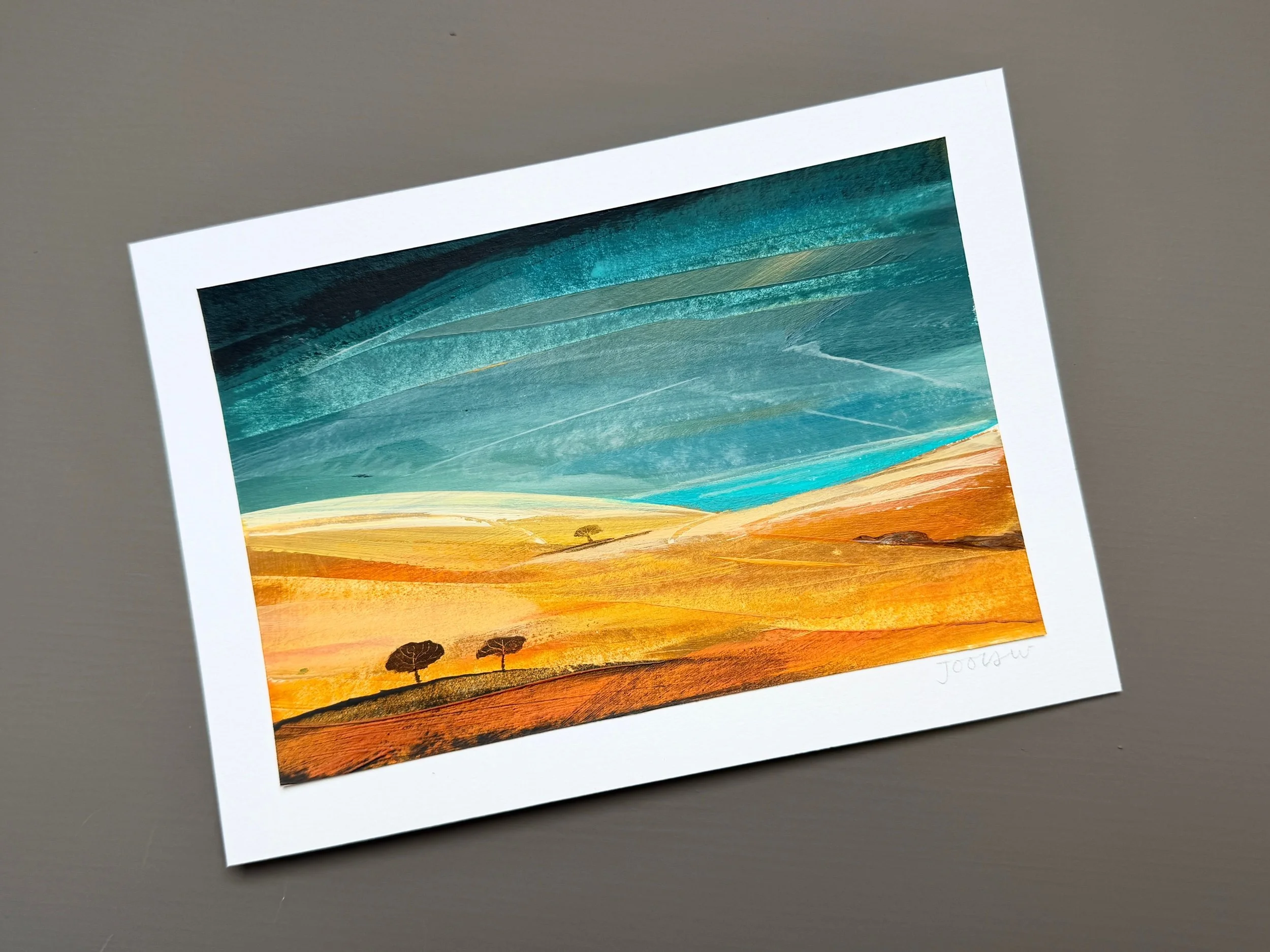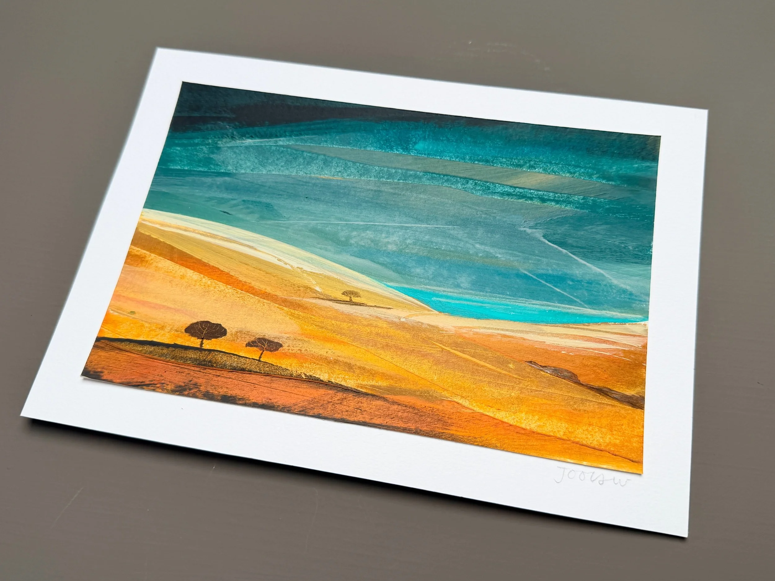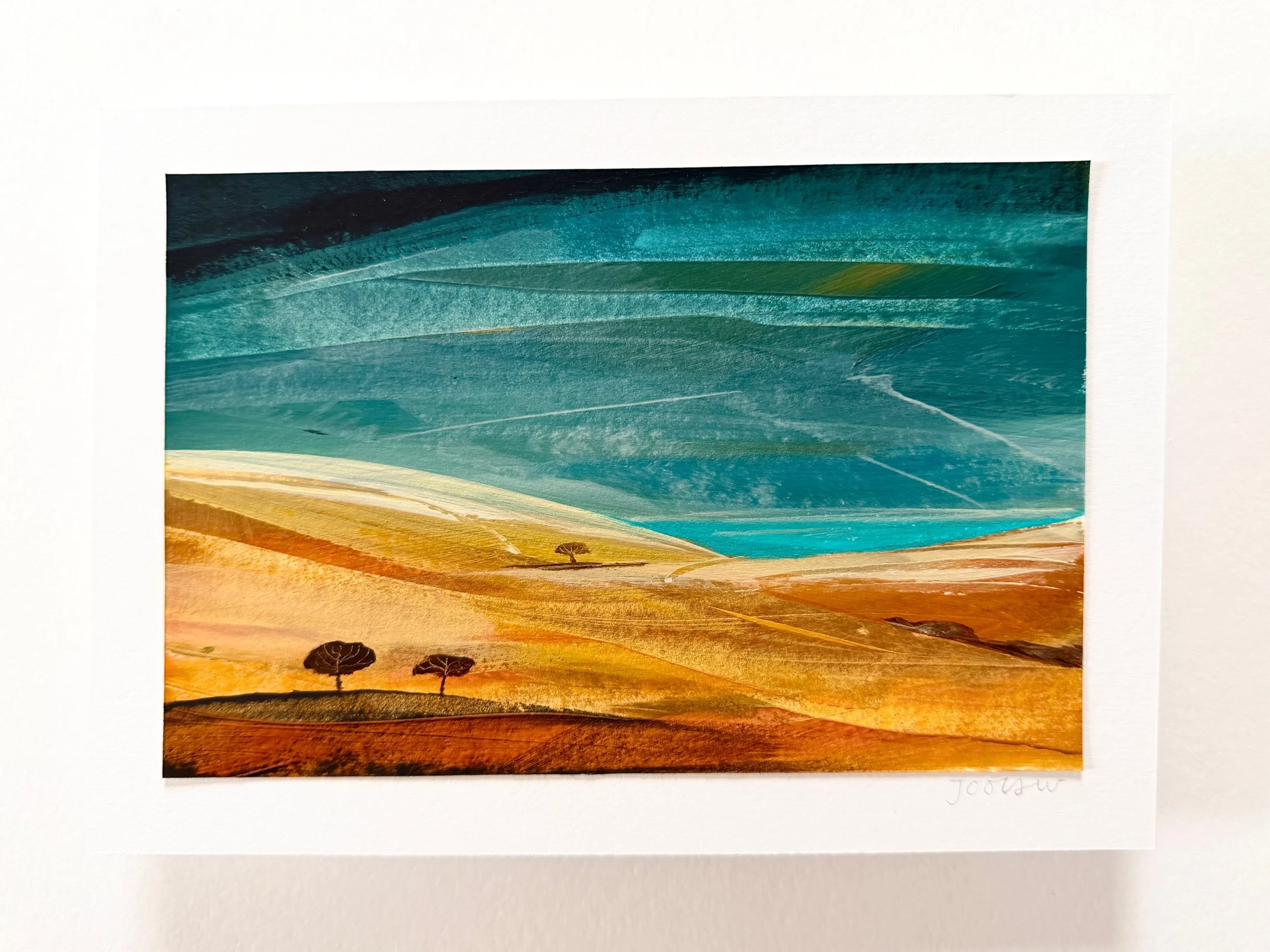 A work on paper using acrylics and pencil and painted as a response to the warm summer of 2025 and the effect of the sun upon the landscape.