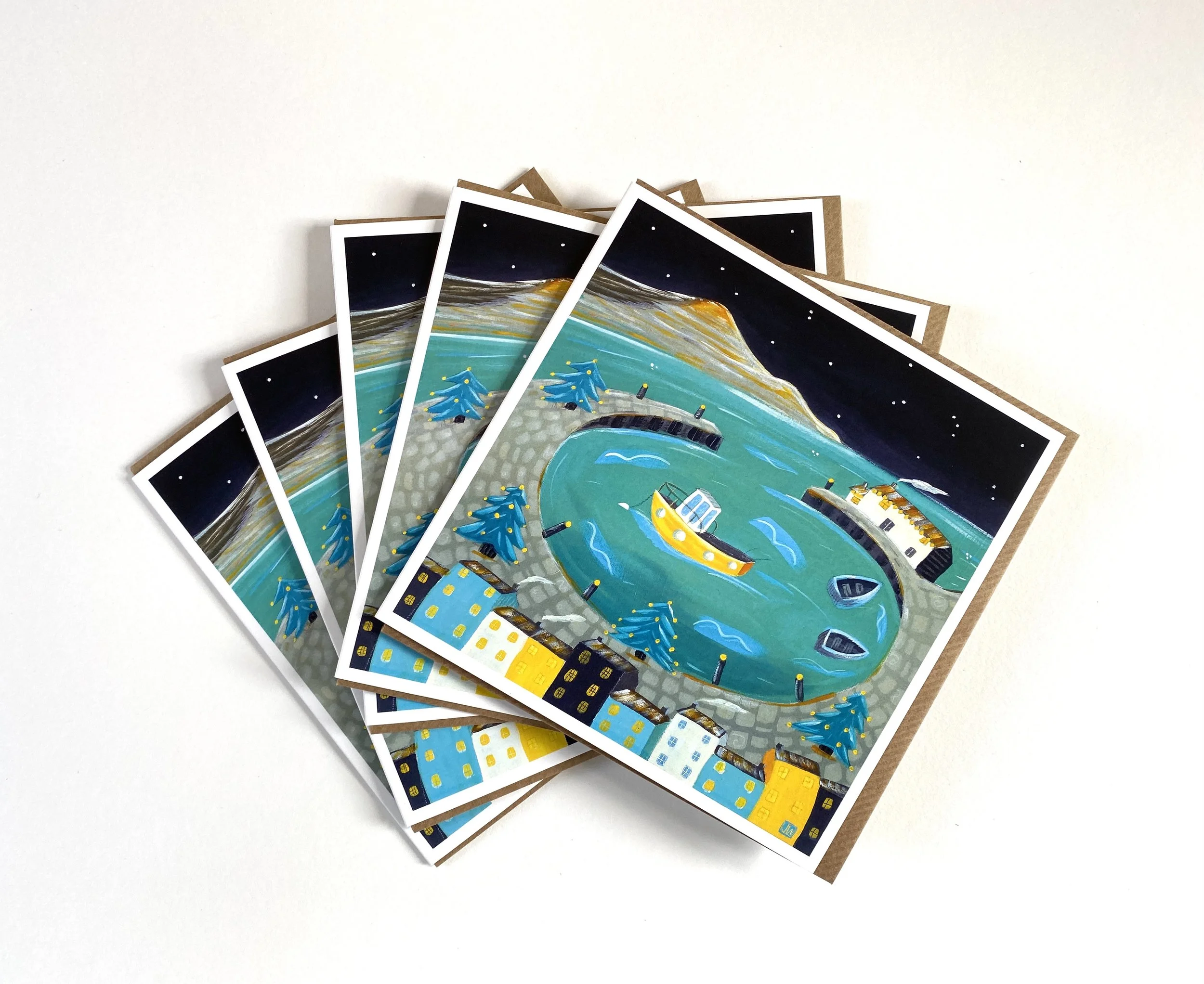 A pack of 5 cards of Lyme Regis looking very festive and twinkly with the Cobb and Golden Cap beyond